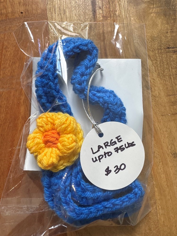 Doggie Darners – Hand-Crocheted Accessories for Your Dog! Let your big pup strut in style with these beautifully handcrafted accessories, designed for dogs up to 75 lbs! Whether they’re feeling regal or simply want to show off their charm, this set has them covered. - Large Blue Collar with Yellow Flower – A bold yet elegant collar featuring a bright yellow flower for a touch of natural beauty. - Large Light Blue Crown – Fit for the king or queen of the house, this soft, crocheted crown lets your pup rule in comfort and style! Perfect for special occasions, photo ops, or just everyday fabulousness—bid now and give your pup the royal treatment! * This item must be picked up in-person at one of these options: SUNNYVALE Friday, March 28 1pm to 3pm The Summit Room at Sport Basement Sunnyvale 1177 Kern Ave, Sunnyvale PALO ALTO Saturday, March 22 & Saturday, March 29 Noon to 4 pm 809 San Antonio Rd. STE 8, Palo Alto NOTE: these are the ONLY pick-up options so please make sure you can pick up from one of the locations within those time frames. The items will not be mailed.